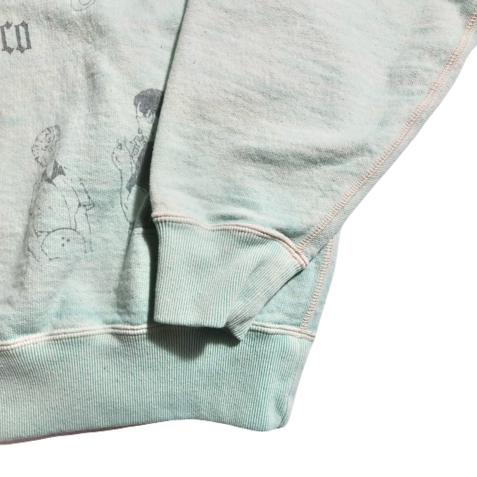表裏共に10番という太い糸を使用したことでドライでざらっとした質感の生まれた裏毛のオリジナルスウェット生地。これはアメリカのカラッとした空気感を体現しており、ヴィンテージライクなグラフィックとプリントの雰囲気にマッチしています。