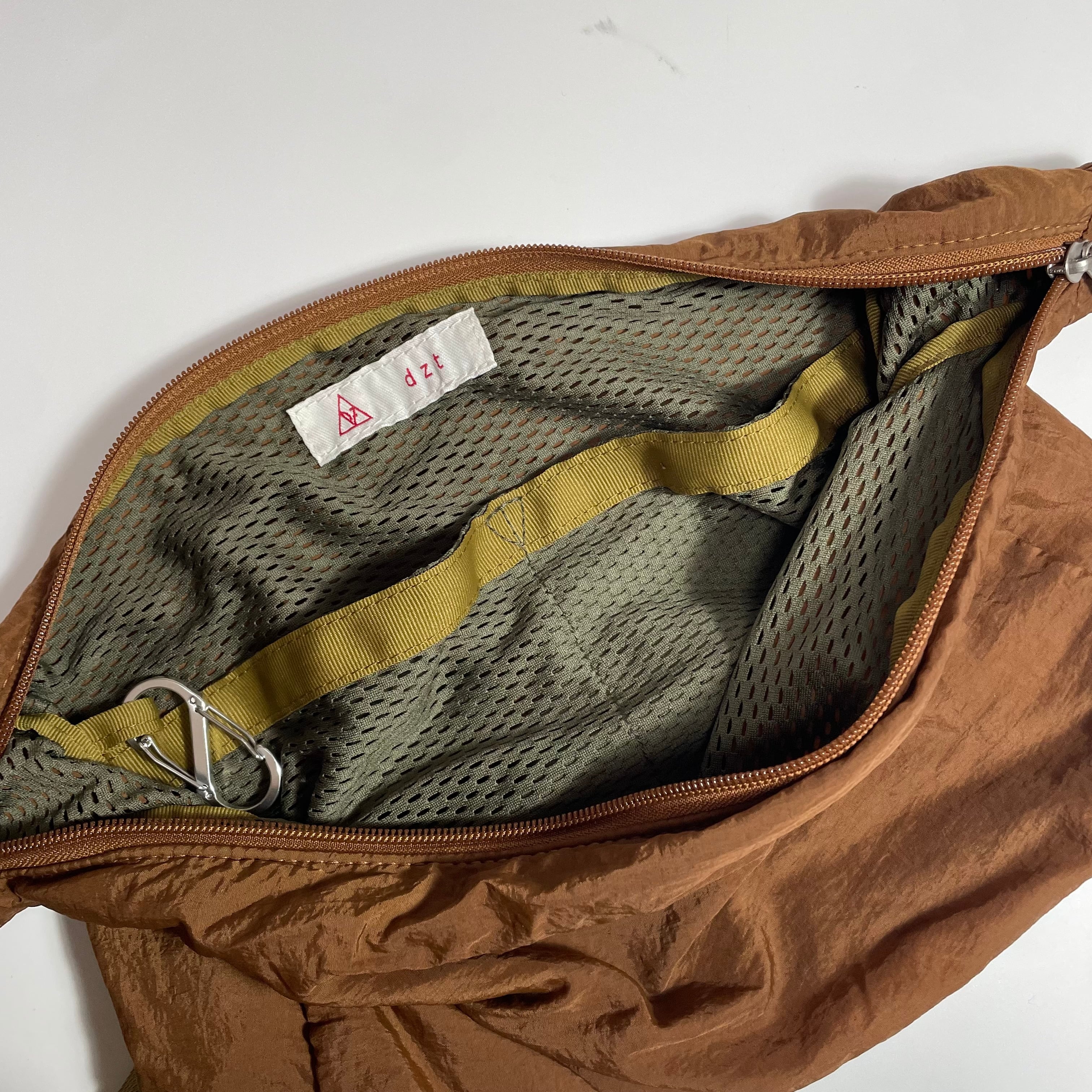 外側はナイロン、裏地はポリエステルのメッシュ素材を使用したバックシリーズです。 衣類用の素材を使用しているので、バック市場に出回らない素材感と色が特徴です。