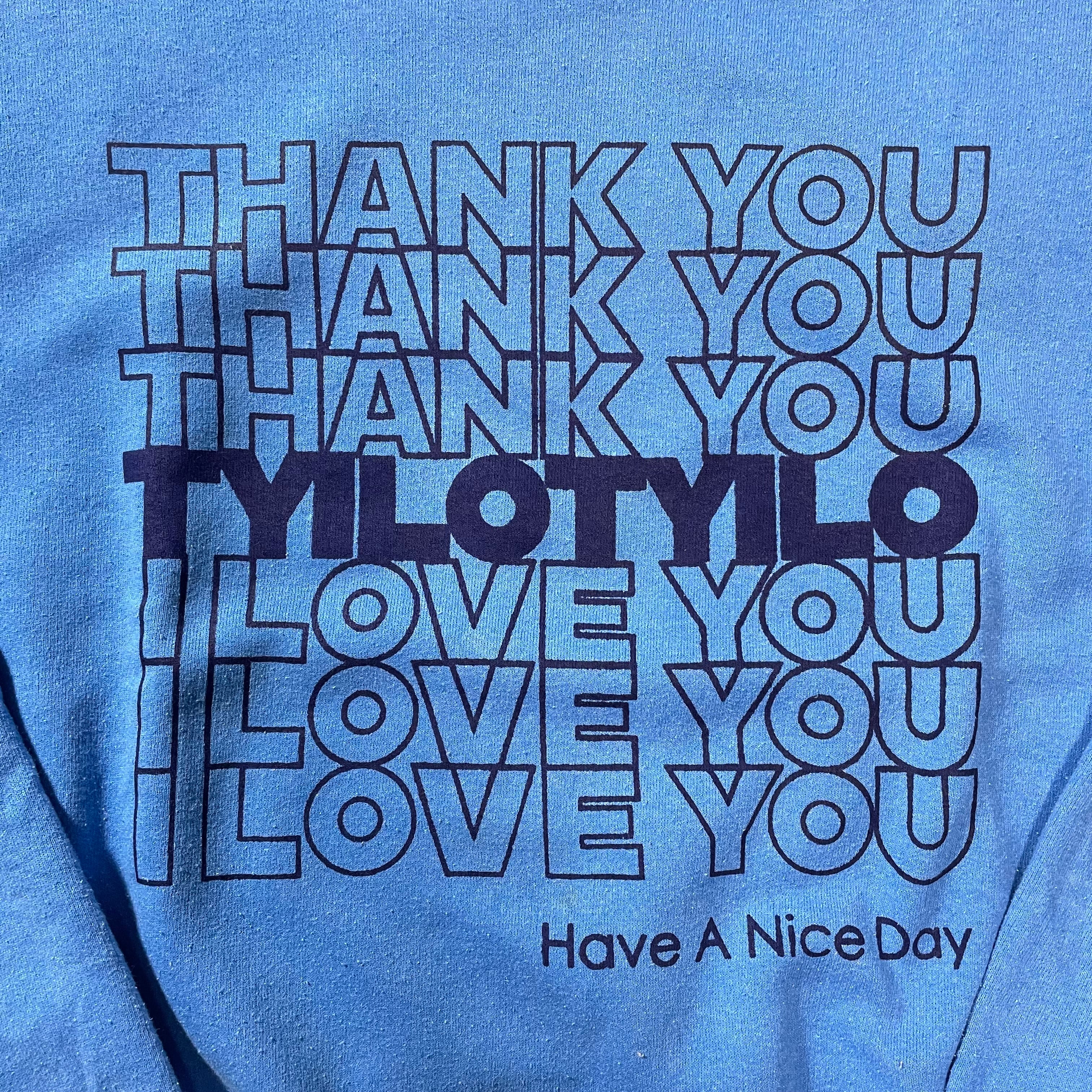 tyiloオリジナルプリントスウェットです。古着のボディにプリントしたスペシャルなアイテムになっております。お買い上げ頂いた方に、オマケでtyiloオリジナルプリントバッグがついてきます!